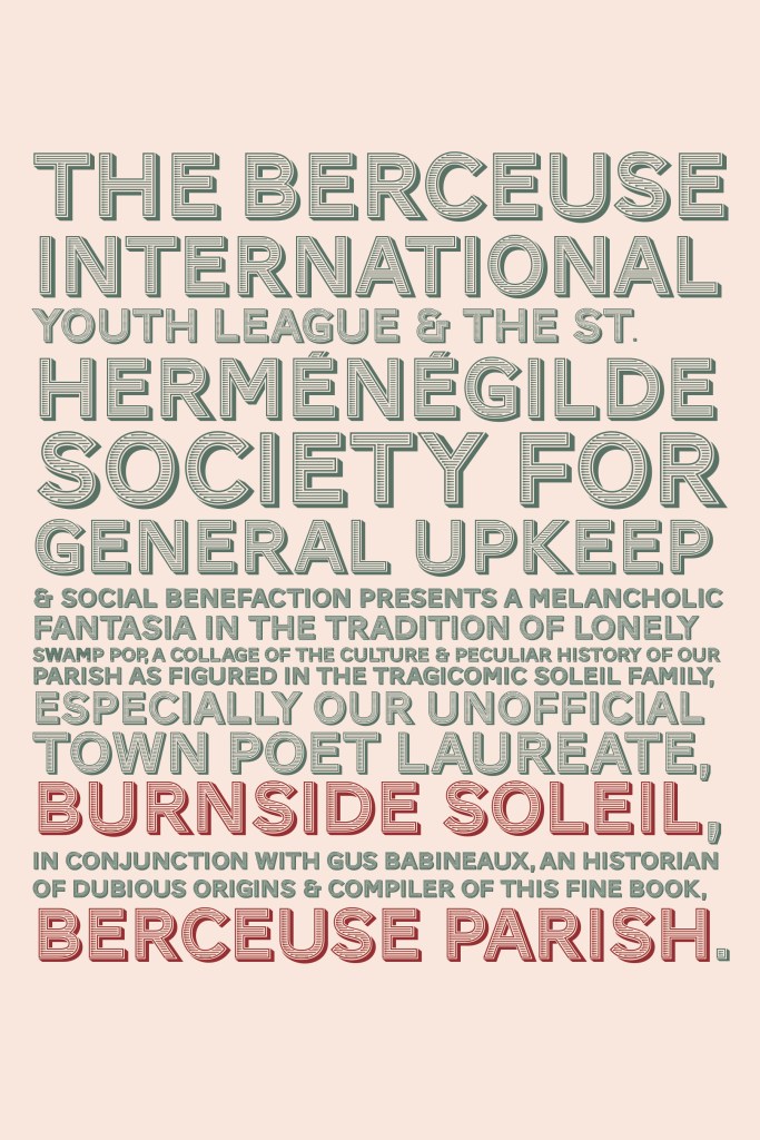 “In his first book, Burnside Soleil inhabits a myth that is almost real, of family, of friends, living and departed, and of the Acadian culture in Louisiana. Soleil’s brilliant, close-grained and perfectly worded lyrical portraits are enlarged by the historical and cultural context of a second curatorial narrator, Gus Babineaux. Soleil’s transcendent accomplishment is to break the heart and restore it to laughter with redemptive irony. Look elsewhere for promise. Berceuse Parish is all there now, and it is a masterwork.”